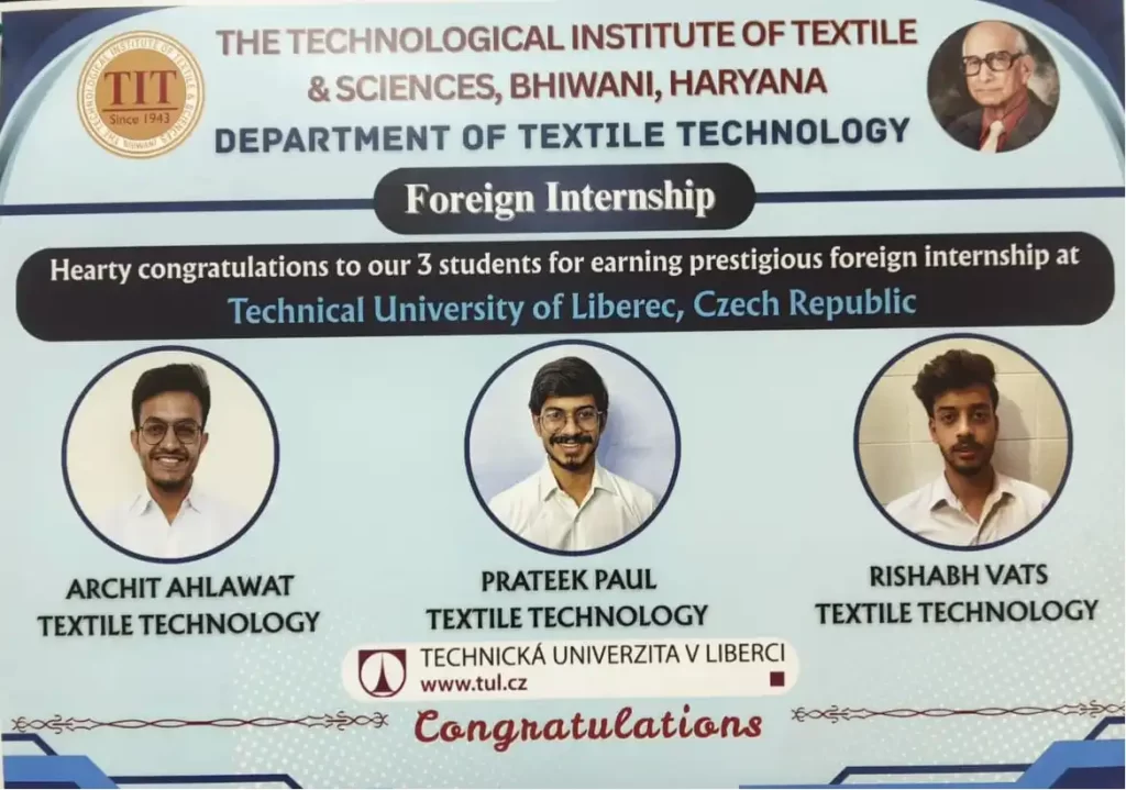 The Department of Textile Technology at The Technological Institute of Textile & Sciences, Bhiwani, proudly congratulates its outstanding students on securing prestigious foreign internships at the Technical University of Liberec, Czech Republic.